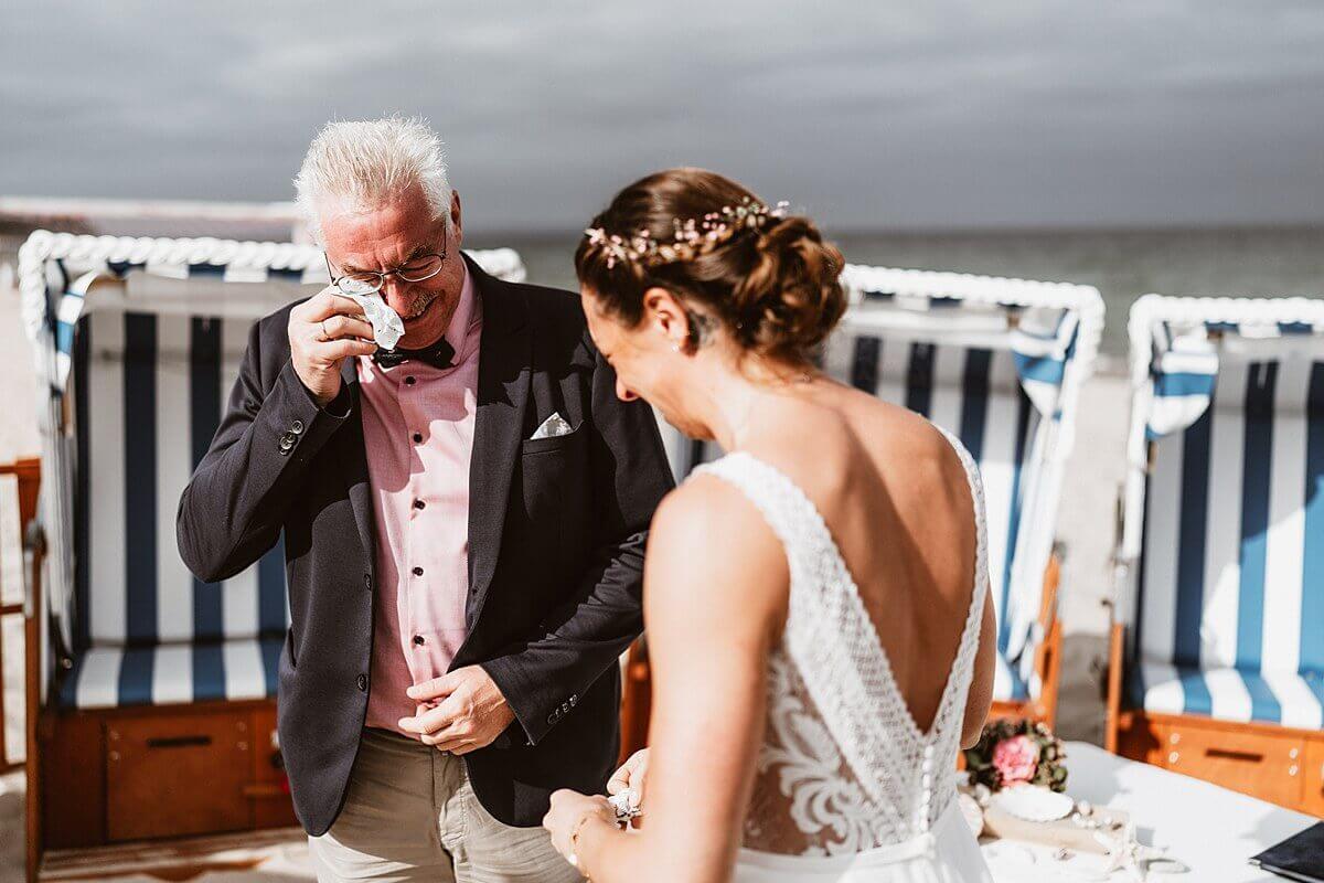 Am nächsten Morgen, direkt nach dem Frühstück, nutzte ich noch die freie Zeit um die Umgebung nach geeigneten Fotospots zu erkunden. Und dann ging es los. Soweit eigentlich Standard, Getting Ready im Hotel, das erste Zusammentreffen der Braut mit ihrem Vater und Weiterfahrt zur Freien Trauung am Strand. Es folgte eine der schönsten Trauungen, die ich jemals fotografiert habe. Pure Emotionen. Wie sich das gehört, flossen natürlich auch ein paar Tränchen. Genau diesen Moment liebt wirklich jeder Hochzeitsfotograf, denn das sind die wahren emotionalen Bilder. Selbstverständlich konnte ich jeden, wirklich jeden der Anwesenden dabei einfangen, wie er seine Tränchen verdrückte. Eine wahre Freude.