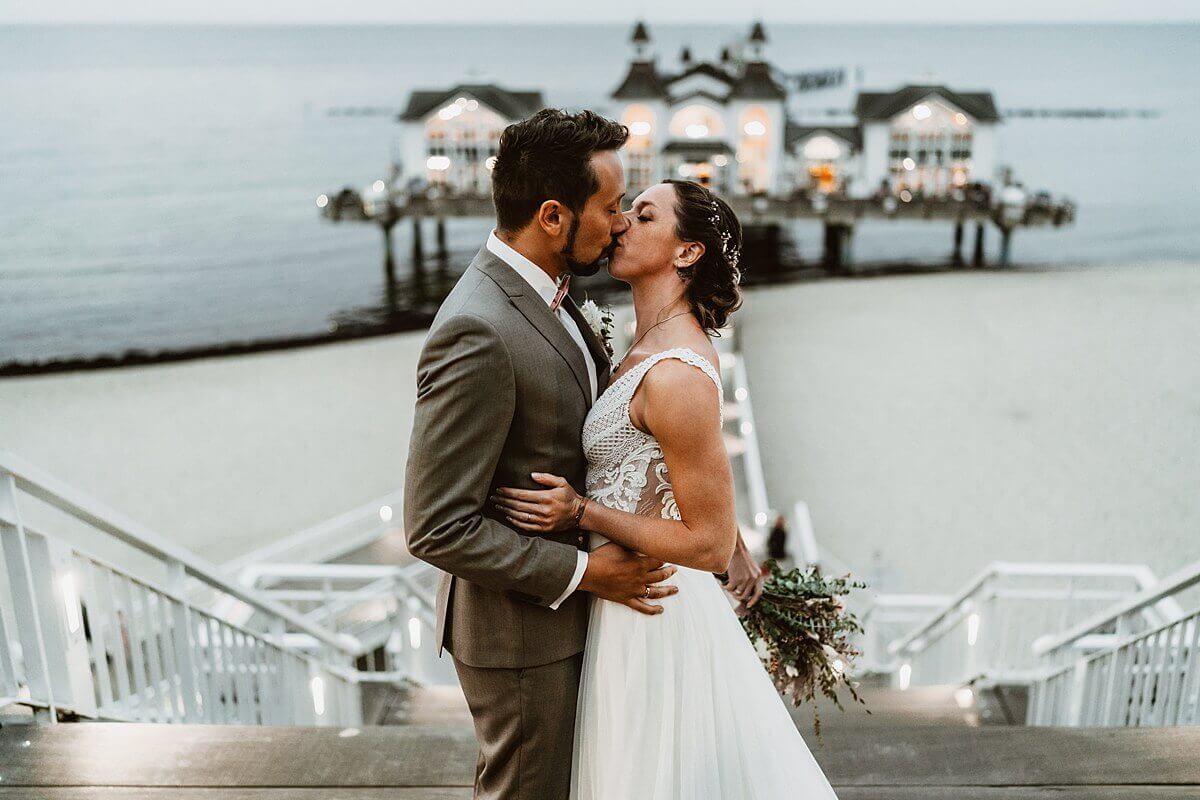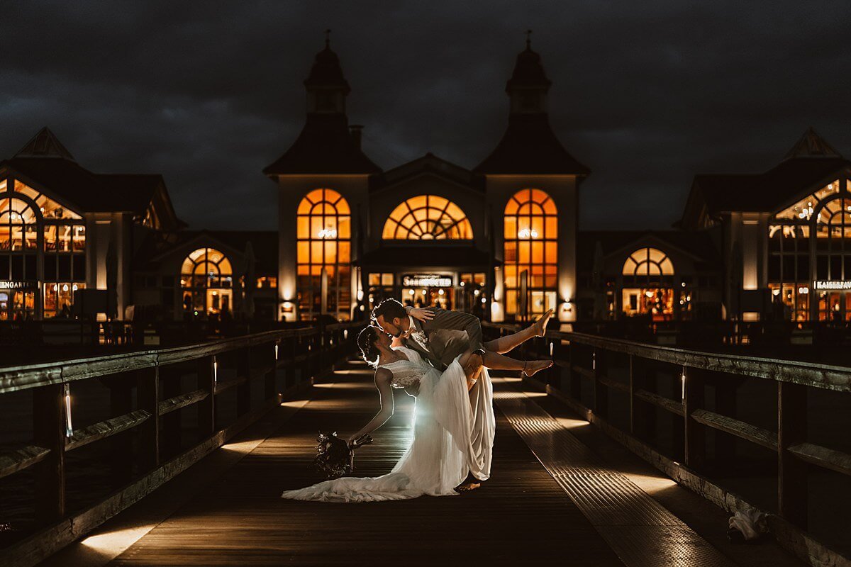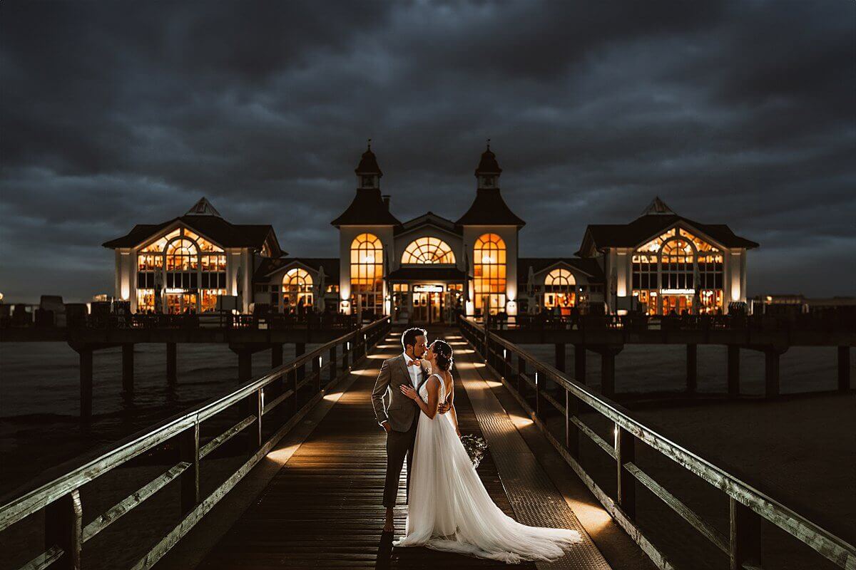 Während die kleine Hochzeitsgesellschaft nun eine Inselkutschfahrt zum Zeitvertreib unternahm, begann für uns ein wahrhaft ausgedehntes Brautpaar-Shooting. Dabei klapperten wir so einige Fotospots ab. Göhren, Thiessow, Sellin und Binz, um nur ein paar wenige zu nennen. Planmäßig beendeten wir das Shooting zum Einbruch der Dunkelheit an der Seebrücke in Sellin.