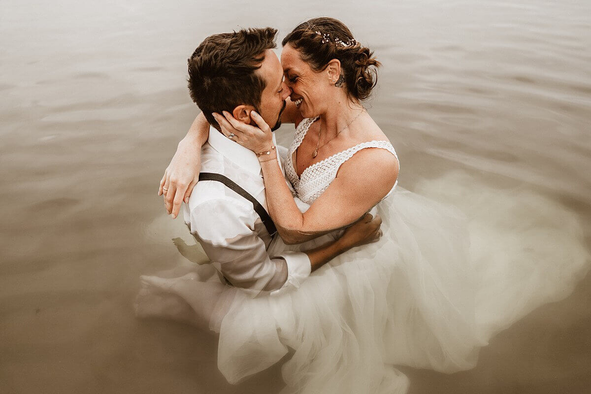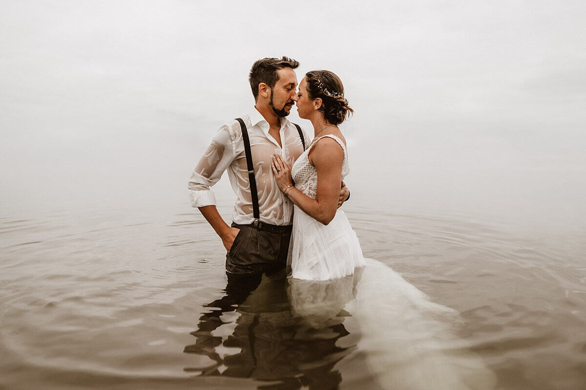 Zur Komplettierung der Hochzeitsreportage trafen wir uns am nächsten Morgen um 6:00 Uhr vor dem Hotel, um dann beim Sonnenaufgang in Form eines kleinen After-Wedding-Shootings noch ein paar Bilder bei Sonnenaufgang im Wasser zu machen. Also im kompletten Hochzeitsoutfit. Der Plan ging nicht ganz auf, denn die Sonne hatte wohl Besseres zu tun als uns so früh Gesellschaft zu leisten. Auch egal, denn für ausdrucksstarke Fotos braucht man keine Sonne.